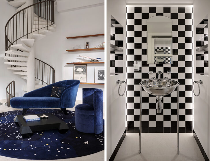 The main room (left) at the new Andrée Putman showroom in Paris features reissued sofas, tables, and rugs by the late designer, as well as an homage to her famous checkered Morgans Hotel bathrooms (right). Photos: Sebastien Veronese