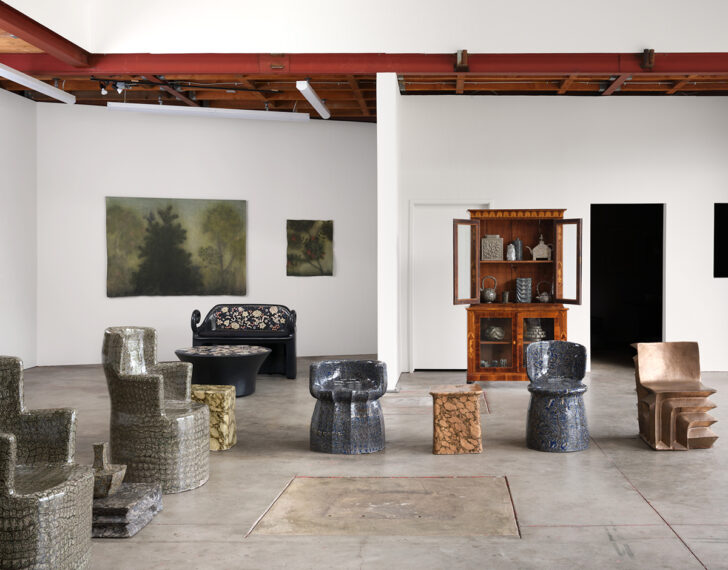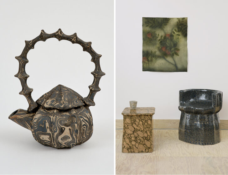 For the exhibition, Rower took as a starting point a room filled with garden-themed frescoes in the ancient Roman Villa of Livia, recreating a similar scenography and mood via walls lined with hazy floral paintings made on antique bedsheets and tablecloths. In the foreground are three families of three-dimensional works: chairs and tables sculpted from stoneware that’s been made to look like marble or travertine, ceramic teapots and vases that subvert traditional forms with obviously contemporary details and surface patterns, and a series of ornate paper pulp and ceramic furnishings with pretty floral epoxy inlays that “allude to the papier-mâché furniture and objet d’art that became popular in 18th- and 19th-century Europe.” We named Rower to our American Design Hot List a year ago with the sense that she was one to watch — it’s nice to see someone mature into a body of work that vindicates our instincts.